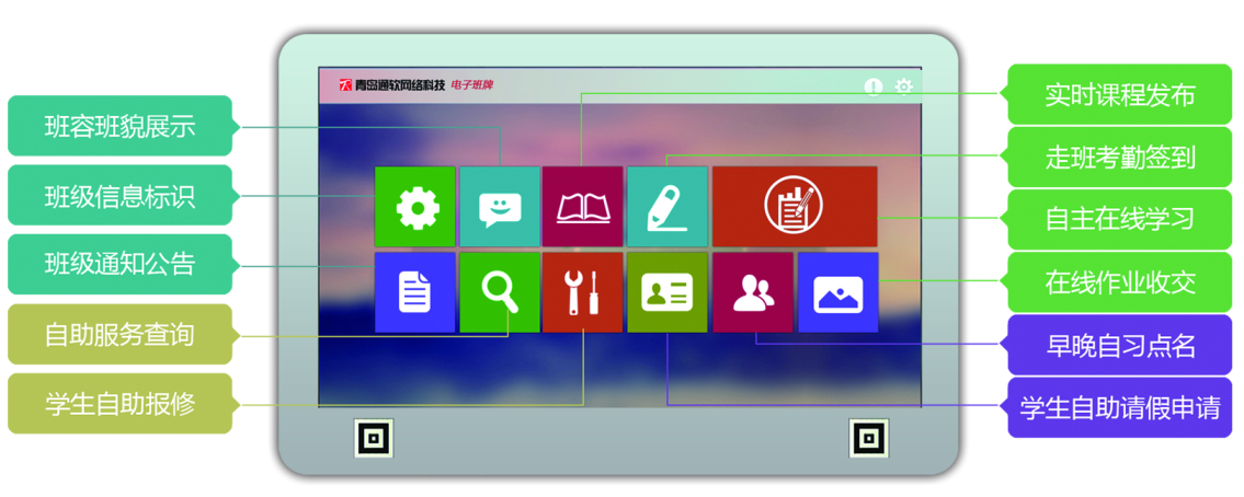 當前,智慧校(xiào)園建設迎來(lái)了(le)新的(de)一(yī)輪發展,電(diàn)子(zǐ)班牌作(zuò)為(wèi)智慧校(xià¥o)園終端信息載體(tǐ)的(de)誕生(shēng),必将開(kāi)創智慧教室建設的(de)新局面。 “通(tōng)軟”電(diàn)子(zǐ)班牌不(bù)再是(shì)傳統意義的(de)“班牌”,它是(shì)一(yī)款集觸摸屏技(jì)術(shù)、RFID技(jì)術(shù)、多(duō)媒體(tǐ)技(jì)術(shù)、智能(néng)雲終端軟件(jiàn)技(jì)術(shù)¥、雲平台技(jì)術(shù)為(wèi)一(yī)體(tǐ)的(de)綜合信息終端。 “通(tōng)軟”電(diàn)子(zǐ)班牌作(zuò)為(wèi)智慧教室建設的(de)終端和(hé)入口,首先緊緊圍繞學校(xiào)教學工(gōng)作(zuò),很(hě♣n)好(hǎo)地(dì)解決了(le)新課改形勢下(xià)的(de)學生(shēng)走班考勤難題、規範了(le)學校(xiào)教學秩序,同時(shí)電(diàn)子(zǐ)班牌還(háβi)成為(wèi)實現(xiàn)學生(shēng)自(zì)主管理(lǐ)、自(zì)主學習(xí)、自(zì)主發展的(de)平台。 此外(wài),電(diàn)子(zǐ)班牌還(hái)是(shì)一(yī)個(gè)班級的(de)标識和(hé)形象展示,是(shì)學校(xiào)班級文(wén)化(huà)建設、德育文(wén)化(huà)建設的(de)一(yī)個(gè)新載體(tǐ)。電(dià≥n)子(zǐ)班牌作(zuò)為(wèi)下(xià)一(yī)代智慧教室建設的(de)核心産品,必将引領智慧校(xiào)園建設提升到(dào)一(yī)個(gè)新的(de)層次。