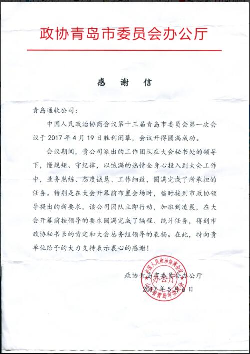 我公司順利完成青島市(shì)政協第十三屆一(yī)次會(huì)議(yì)委員(yuán)會(huì)議(yì)保障工(gōng)作(zuò)2017-05-10