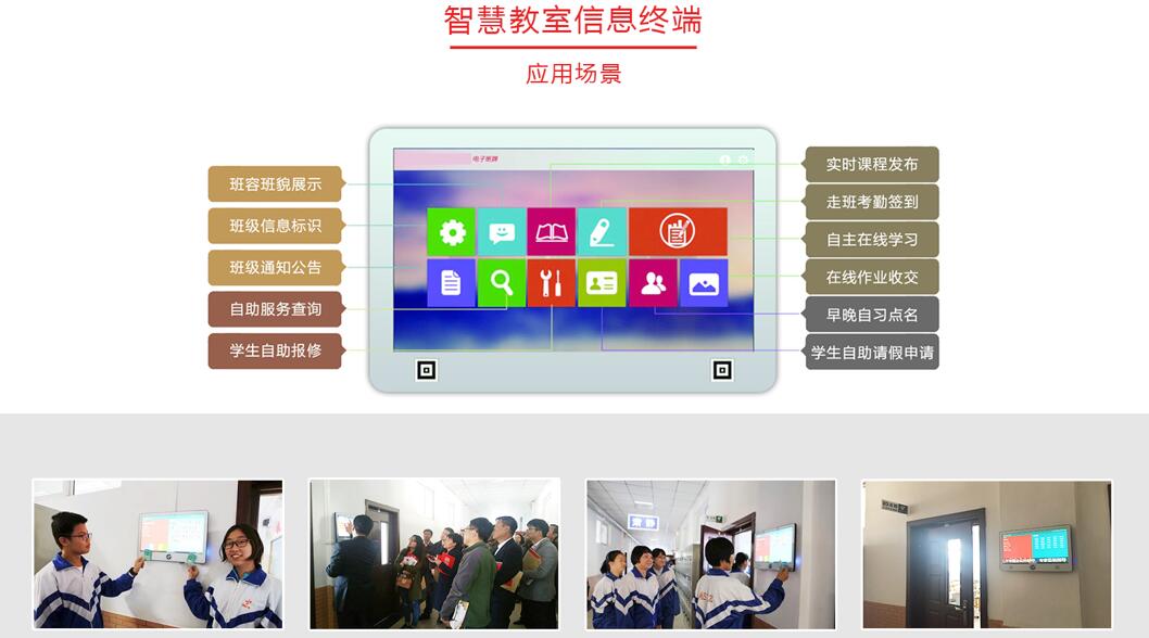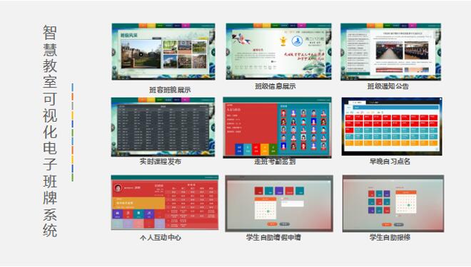 智慧教室解決方案:融合班牌終端、教務課表、教務考勤、場(chǎng)所預約、門(mén)禁聯動于一(yī)體(tǐ)的(de¥)針對(duì)教室場(chǎng)景的(de)安全、管理(lǐ)、展示、節能(néng)解決方案。 電(diàn)子(zǐ)班牌終端是(shì)安裝在校(xiào)內(nèi)各個(gè)教室門(mén)口的(de)交互式智慧教室信息終端,是(shì)一(yī)款21.5寸多(duō)媒體(tǐ)觸控一(yī)體(tǐ)機(jī)設備,功能(néng)及信息發布、教務考勤、自(₩zì)主請(qǐng)假報(bào)修等功能(néng)及一(yī)身(shēn)的(de)智慧終端,是(shì)學生(shēng)與學校(xiào)交互的(de)重要(yàoγ)工(gōng)具,是(shì)校(xiào)園內(nèi)各系統串聯的(de)重要(yào)載體(tǐ)。