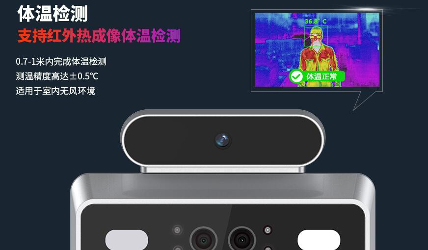l 安卓7.1操作(zuò)系統,采用(yòng)強大(dà)的(de)RK3399CPU方案; l 人(rén)臉識别:采用(yòng)高(gāo)級的(de)人(rén)臉識别算(suàn)法技(jì)術(shù)檢測人(rén)™臉; l 溫度檢測:采用(yòng)紅(hóng)外(wài)熱(rè)成像技(jì)術(shù)進行(xíng)溫度檢測;0.5米內(nèi)完成體(tǐ)溫檢測,測溫精度高(gāo)達±0.5℃ l 高(gāo)溫報(bào)警:溫度高(gāo)于37.3°設備自(zì)動報(bào)警,利于疫情對(duì)重點關注人(rén)員(yuán)管控; l 口罩識别:不(bù)帶口罩有(yǒu)語音(yīn)提示; l 內(nèi)置二維碼讀(dú)頭,可(kě)對(duì)接全國(guó)各地(dì)健康嗎(ma)平台; l 身(shēn)份證識别:可(kě)選內(nèi)置二代證模塊,實現(xiàn)對(duì)人(rén)員(yuán)身(shēn)份鑒别及體(t"ǐ)溫檢測; l 支持4G功能(néng):可(kě)選4G模塊,沒有(yǒu)網線接入的(de)臨時(shí)搭建場(chǎng)景和(hé)偏遠(yuǎn)場(chǎng)景實現(≤xiàn)數(shù)據傳輸; l 支持強光(guāng):可(kě)在戶外(wài)強光(guāng)、背光(guāng)、逆光(gu≈āng)等惡劣環境使用(yòng); l 人(rén)臉識别測溫終端支持語音(yīn)/視(shì)頻(pín)呼叫:訪問(wèn)者可(kě)以通(tōng)過對(duì)講系統的(de)呼叫訪問(wèn) l 支持多(duō)模塊擴展(二維卡、刷卡等) l 支持雲端和(hé)本機(jī)端識别,個(gè)性化(huà)定制(zhì) l 支持存儲大(dà)于30000張人(rén)臉 l 多(duō)種安裝方式:支持壁挂、閘機(jī)支架、桌面支架、立柱支架安裝 |